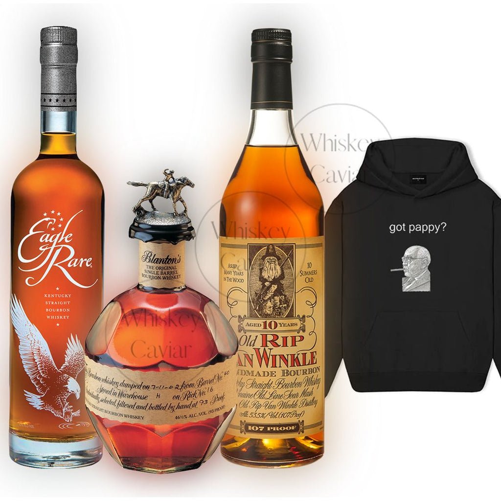 The Blanton’s, Eagle Rare, Old Rip Van Winkle, and Got Pappy? Black Hoodie Value Bundle is a perfect pairing of premium bourbons and stylish bourbon-themed apparel. This exclusive set includes three iconic whiskeys and a sleek black “Got Pappy?” hoodie, making it a must-have for collectors and bourbon lovers. Available exclusively at Whiskey Caviar, this bundle offers the ultimate combination of luxury and style.